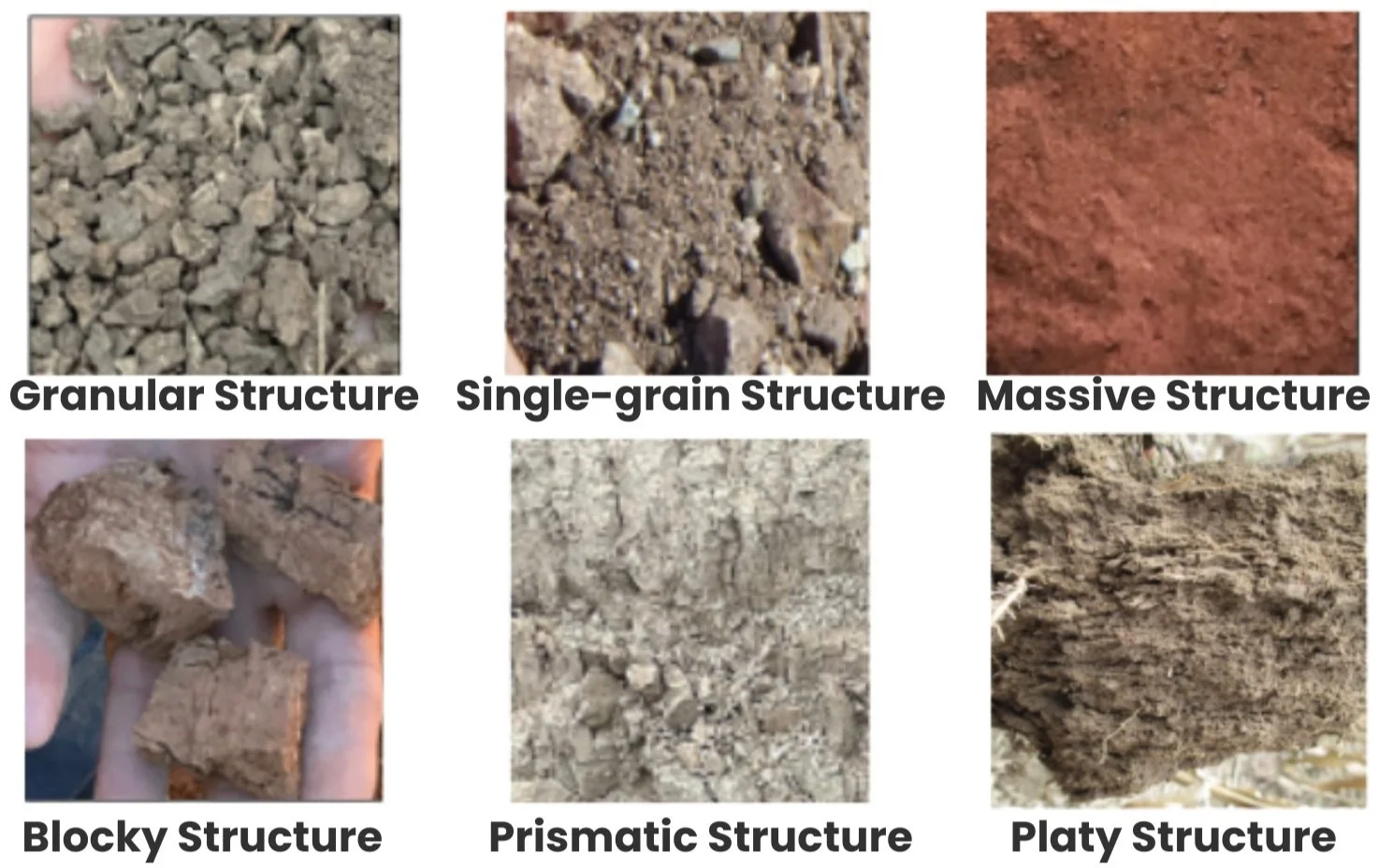 Structure refers to the arrangement of soil particles. Soils made up of practically all sand or all silt do not show any appreciable structural arrangement because of a lack of the binding properties provided by clay. A well-developed structure usually indicates the presence of clay.